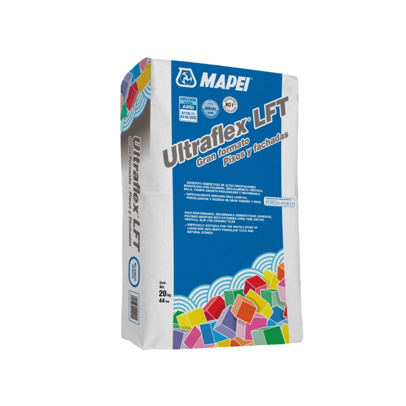 Adhesivo cementicio para piezas de gran formato en pisos y fachadas, con deslizamiento vertical nulo.